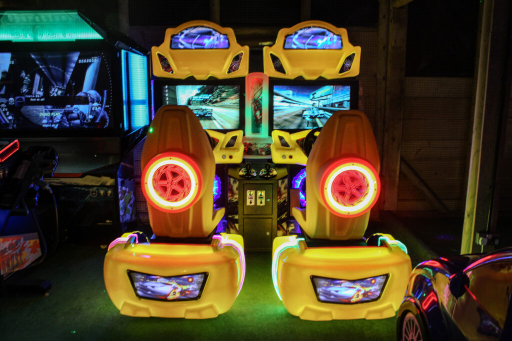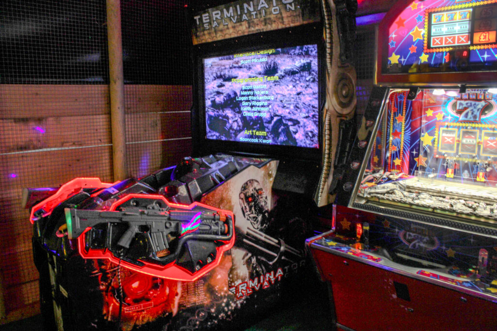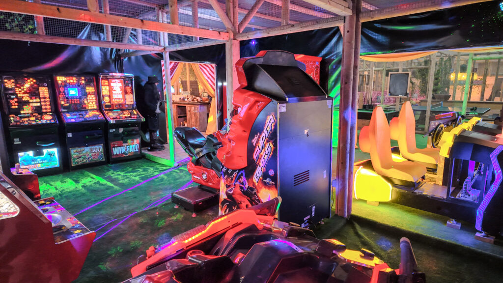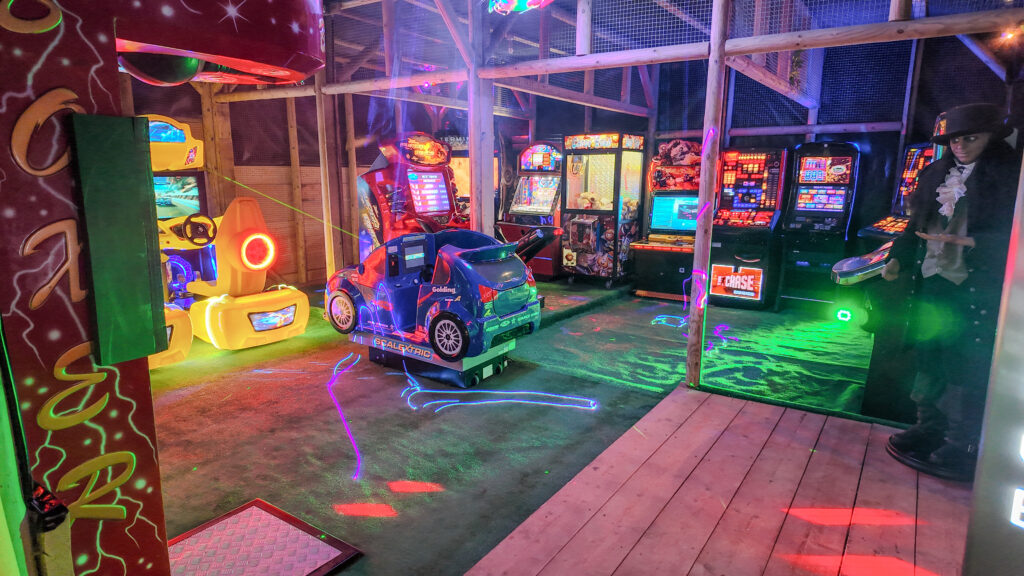 The colourful staging and carnival-style entrance make it more than just a games room. It becomes part of the overall experience — somewhere children can burn off energy, teenagers can compete, and adults can join in rather than just watch.